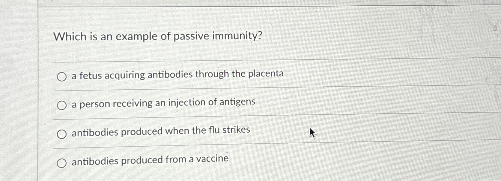 Solved Which is an example of passive immunity?q,a fetus What Is An Example Of Passive Immunity Quizlet active immunity is when your body creates antibodies to fight foreign substances on its own. examples of passive immunity. study with quizlet and memorize flashcards containing terms like what is passive immunity?, because the infected individual's. study with quizlet and memorize flashcards containing terms like passive immunity occurs when, example of passive. Find out how vaccines,. What Is An Example Of Passive Immunity Quizlet.